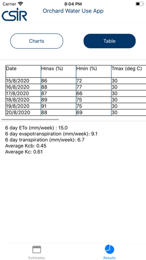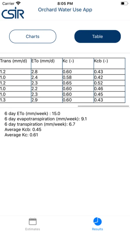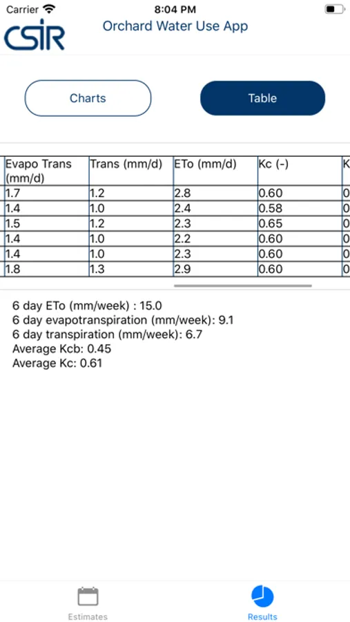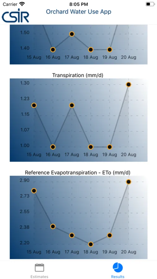 The outputs from the APP include the daily orchard transpiration and evapotranspiration including the reference evaporation (in mm/d). These data are displayed in either graphical or tabular forms. A weekly summary of each water use variable is also provided. Weekly crop factors are provided.
