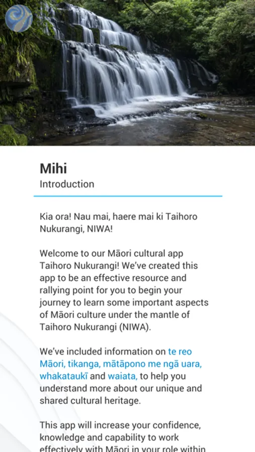 To help you understand more about the unique and shared cultural heritage of Aotearoa, the app includes information on te reo Māori (the Māori language), tikanga (customs), mātāpono me ngā ūaratanga (principles and values), karakia (prayers/ affirmation) and waiata (songs),
