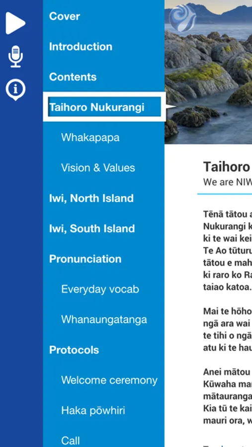 Interactive features include pronunciation of Māori words, maps with Māori names and iwi groups, values and principles, mihimihi / pēpeha (introductions), ngā mihi (greetings), poroporoaki (farewells), karakia (prayers/ affirmation) and waiata (songs).