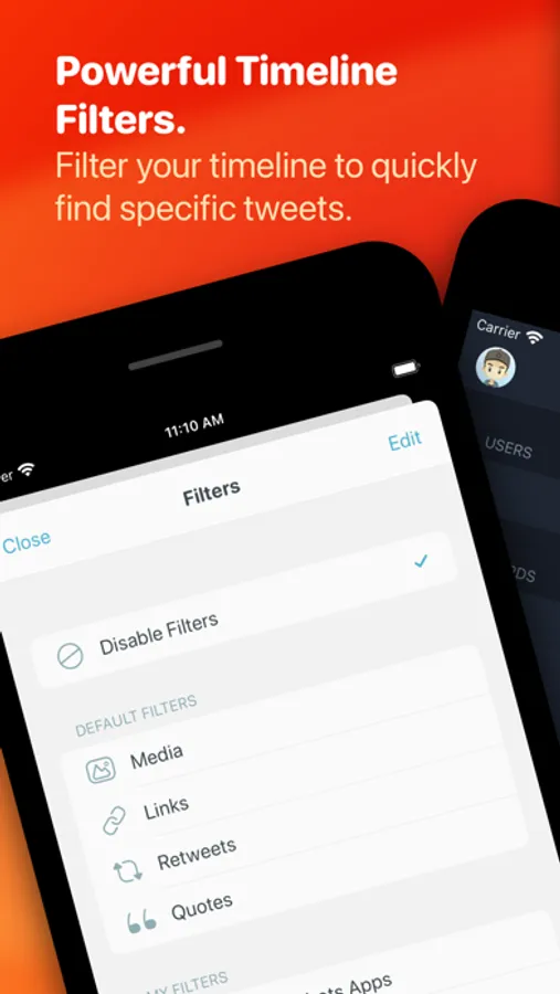 Quickly filter a timeline to show only tweets with media, retweets, links, or create your own keyword or rules-based filter. Access these saved filters any time with two taps.