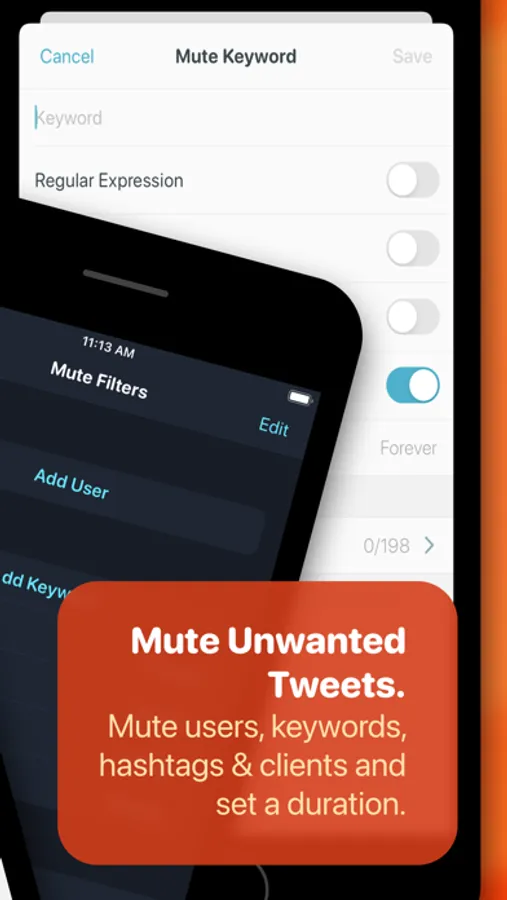 Hide Tweets in your timelines by specific users, keywords, hashtags, or even the client that published the Tweet. Select the length of time to mute and use regular expressions for smarter muting.