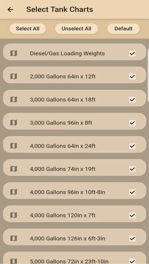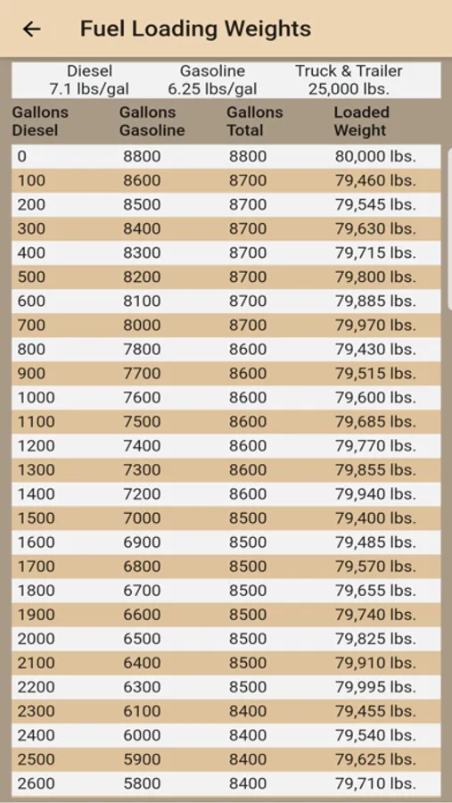 Lookup Tank Charts and Diesel/Gasoline Loading Weights.