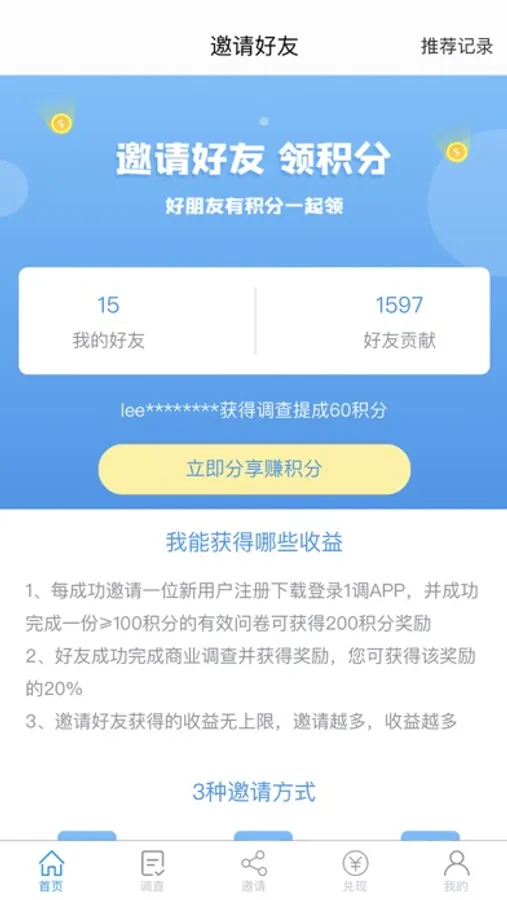 2、推荐好友赚钱:邀请好友双重收益,推荐成功即得200积分,好友完成调查还可持续获得20%提成,收益无上限