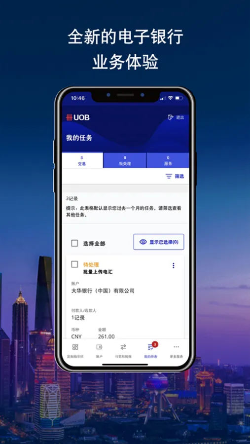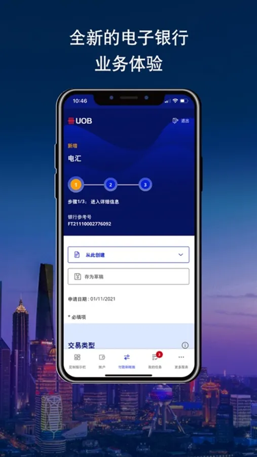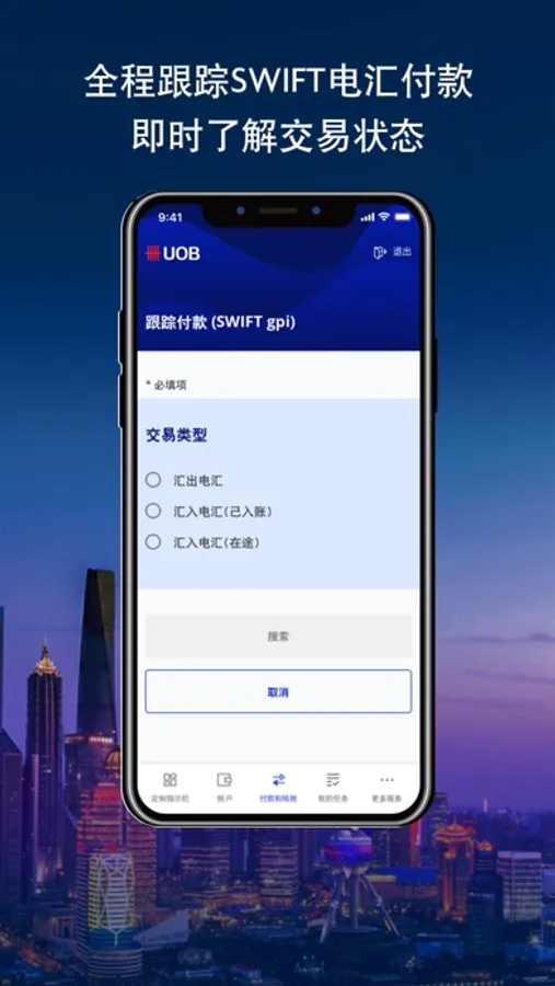 转账付款:快速便捷地进行行内转账、跨行转账以及电汇付款。