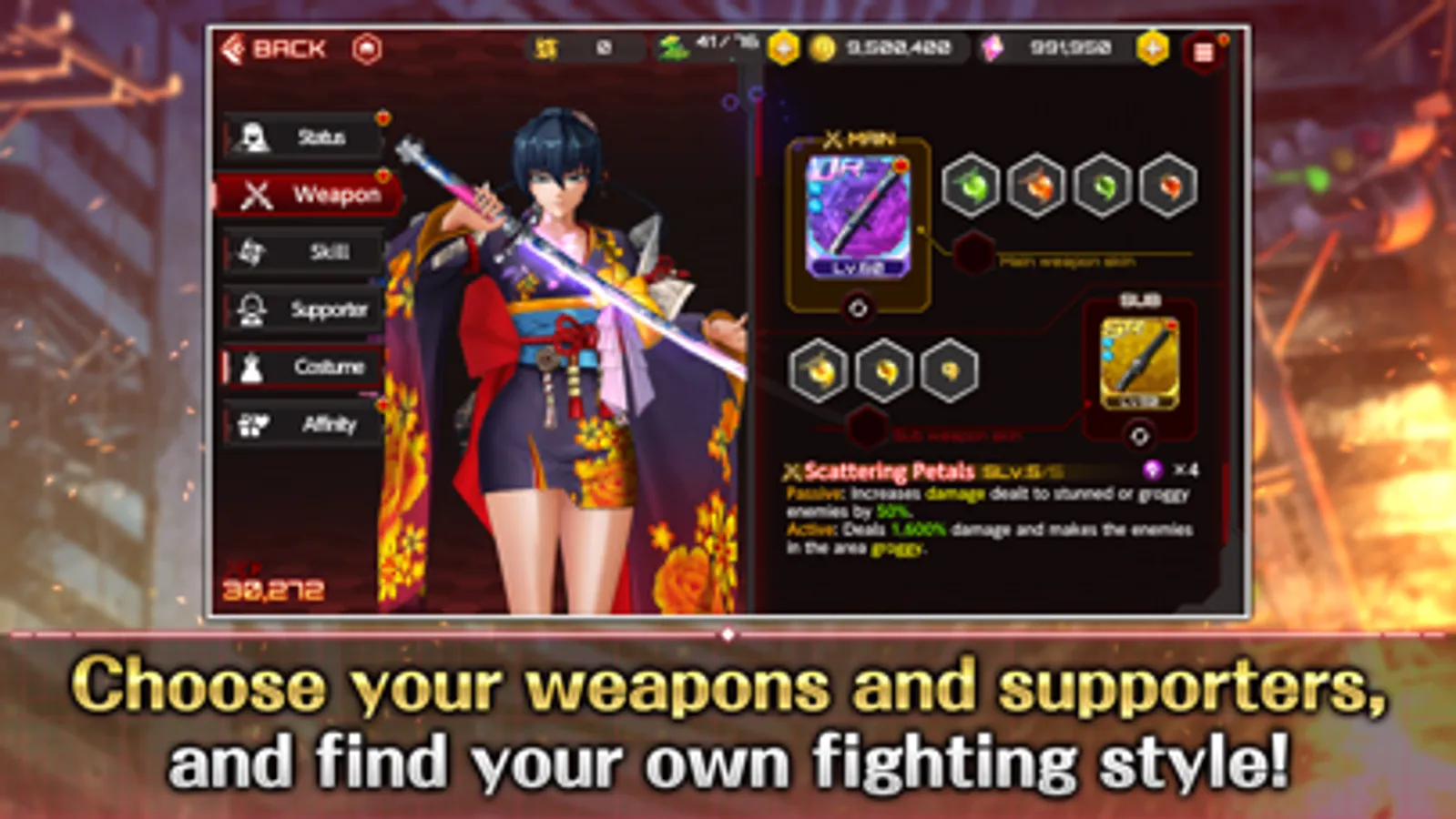 Combine skills, supporters, and weapons to customize your combat style!
