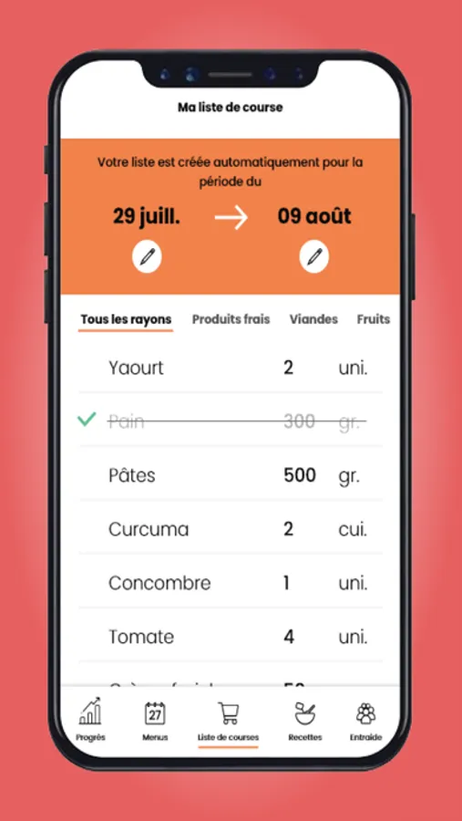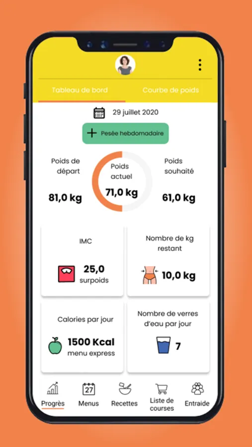 Suivez vos résultats grâce au tableau de bord et à la courbe de poids disponibles sur votre espace personnel. Pratique également : votre liste de course se génère automatiquement pour vous faciliter la tâche au quotidien.