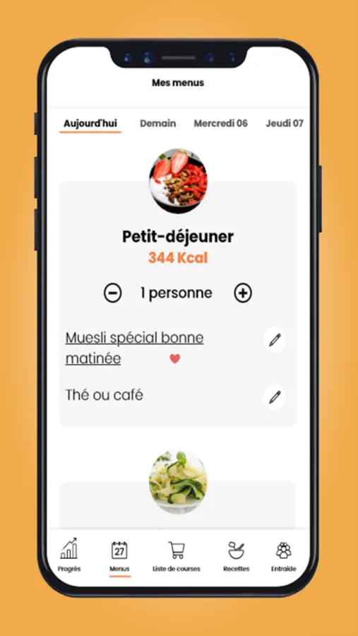 Suivez chaque jour les menus de nos diététiciennes : petit-déjeuner, déjeuner, collation et dîner ou personnalisez-les selon vos goûts et vos envies. Nous vous proposons des plats équivalents en calories pour varier les plaisirs.