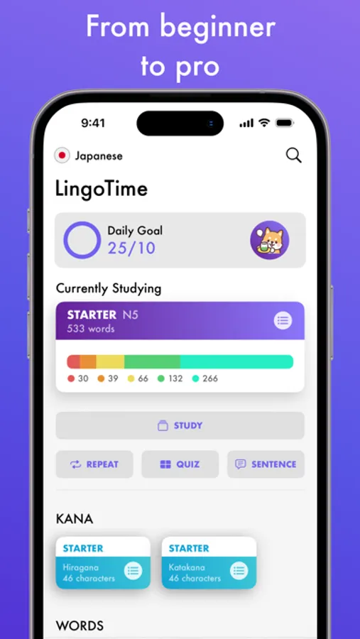 LingoTime is your language learning companion to study Japanese words and kanji, intermediate English, French, German, Russian, and Spanish.