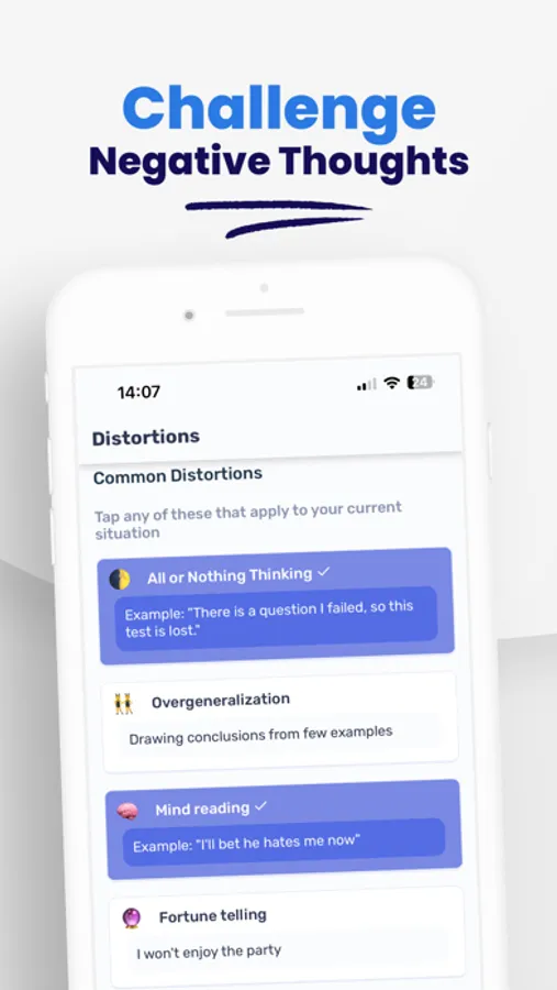 Thought challenging - negative feelings often arise from our thoughts about situations and events in life. Cognitive behavioural therapy teaches us to identify such thought patterns that are not logical, called "cognitive distortions." In Marbles, the process of challenging thoughts is structured: recording the thought, identifying distortions, challenging the thought, and creating an alternative thought. The tool and various distortions are also covered in short lessons.