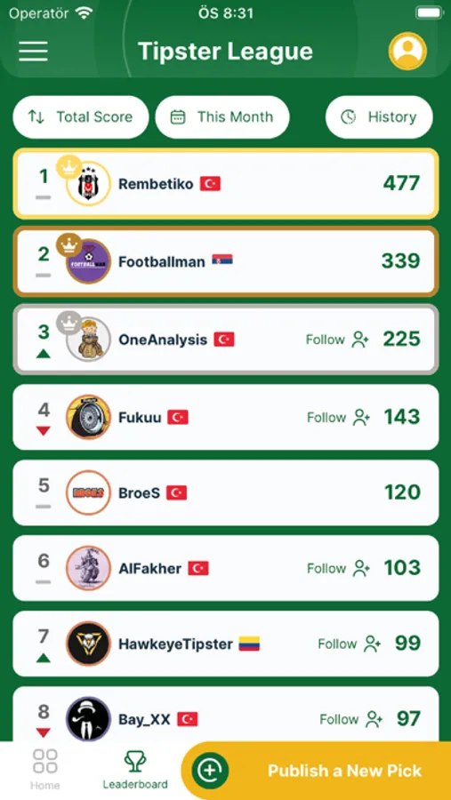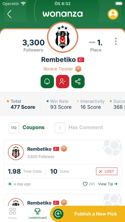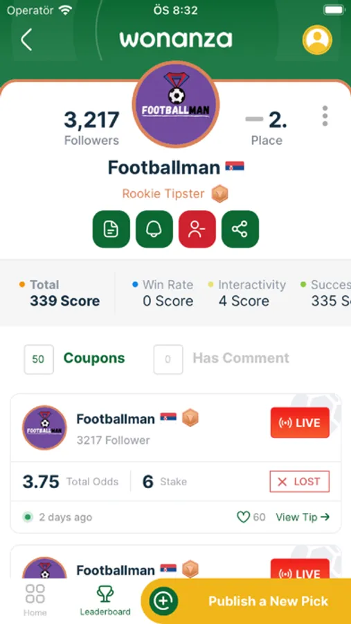 Being trustworthy and transparency comes first for us! We established a statistical system that reflects a tipster's success or failure as it is. We have built this system on performance criterias that must be used in the evaluation of professional betting tipsters; stake, yield, hit rate, ROI (Return of investments), average odds and profit. You transparently know the outcome summary in Wonanza. You can also analyze our punter stats on a weekly, monthly, and all-time basis. You can even see the tipster leaderboard with those stats! Completely transparent!