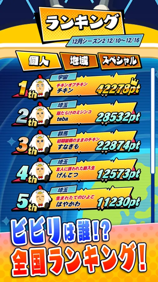『全国 ビビリバトル』で遊ぶことでランキングポイントが加算され全国のプレイヤーとランキングを競うことができます。