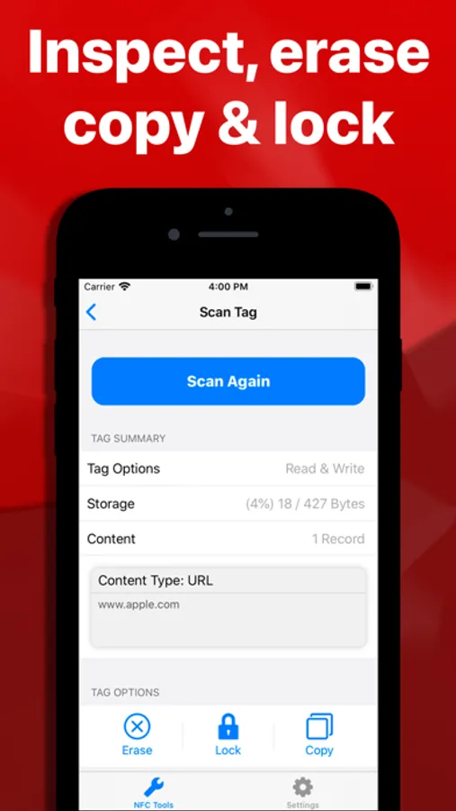 Read a tag by touching the back of your device against it and Smart NFC Tools will show you a full report on the tag's content and give you options such as erase, lock and copy. It's super easy!