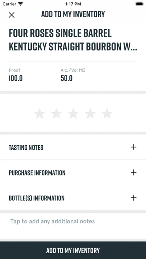 Organize: Add your purchase information price, purchase date, price per bottle, and quantity purchased, as well as other details about each bottle, including bottle year, batch number, barrel number, bottle number, and proof