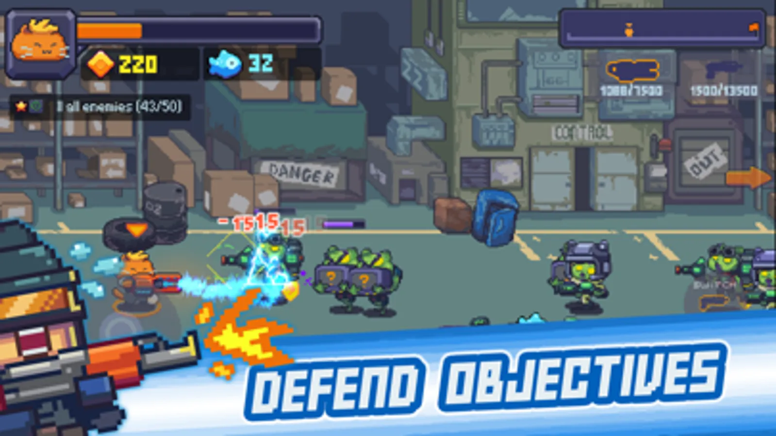 Earn coins and bucks as you play to unlock members of the Cat Fire - Pixel Shooter and upgrade their stats: like power up damage, increase health base and speed to blast off mindless zombies.