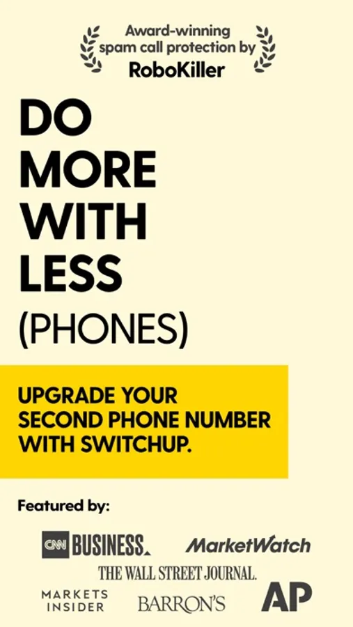 Get a second phone number in less than 3 minutes with SwitchUp! SwitchUp is the first second-phone-line app designed from the ground up with spam protection and your privacy in mind. SwitchUp’s spam blocking is powered by RoboKiller - the leading spam call blocking app with over 11 million downloads!