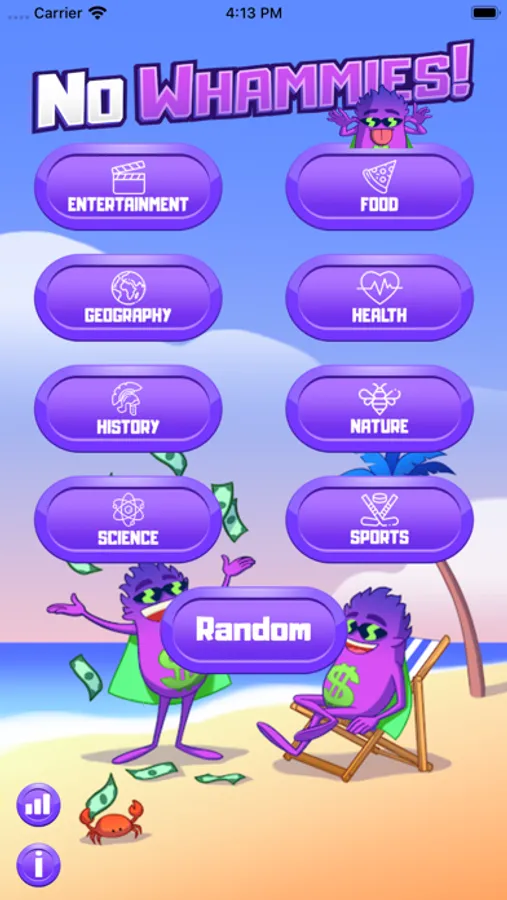 Inspired by the popular game show Press Your Luck, No Whammies! is a fun trivia game where you earn spins by answering questions correctly. The spins are taken on the No Whammies! game board that's full of fabulous prizes and excitement! Oh, and did we mention there are whammies? Yup! Land on a whammy, and he'll take your money. Though, not all whammies are terribly greedy, leaving you with zero bucks. Some will take only a portion so you can hopefully leave a winner!