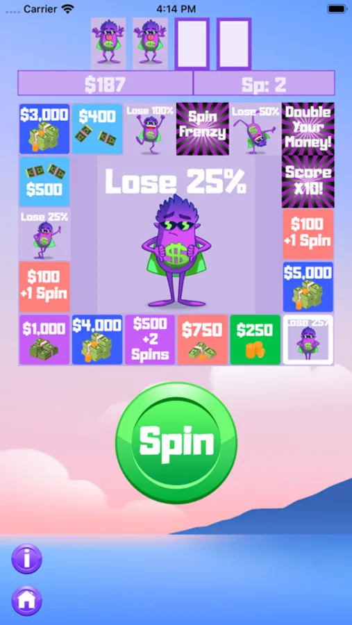 • Spin Frenzy: Land on this, and enter Frenzy Mode! The board will automatically spin for 5 turns, racking up all the dough and additional spins you land on! But if you land on a whammy during Frenzy Mode, the Frenzy Mode ends, and the normal game resumes.