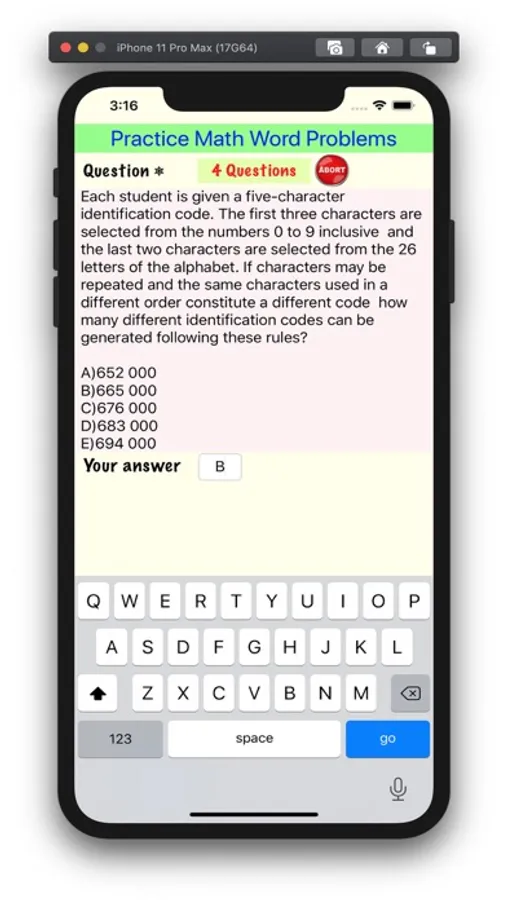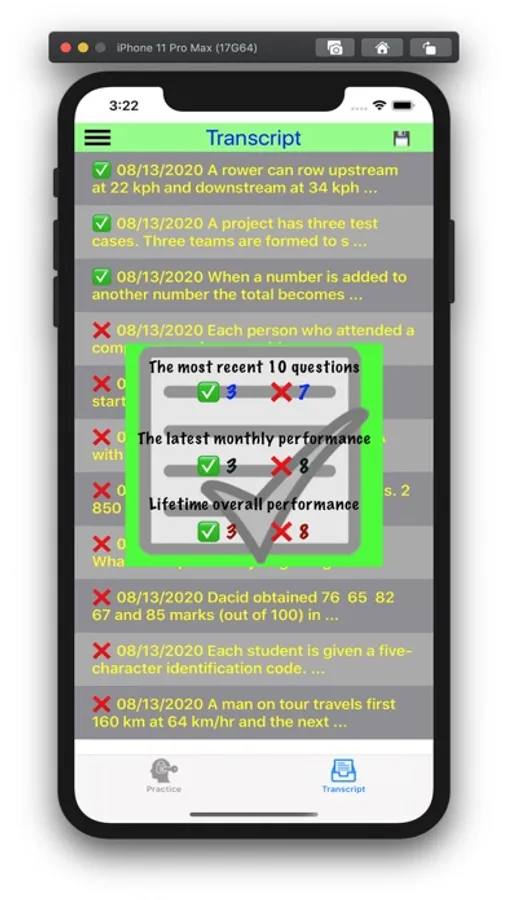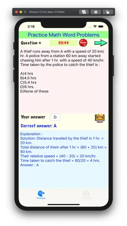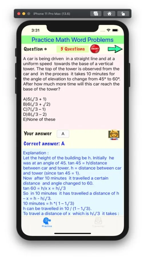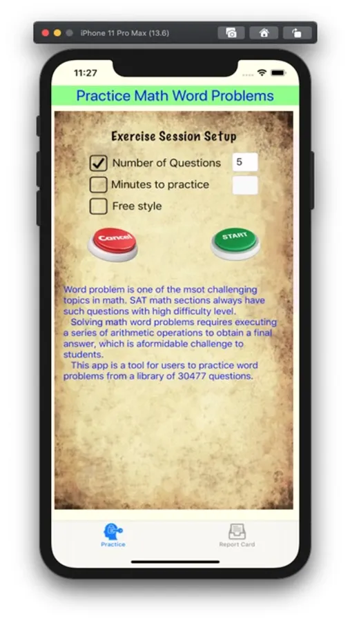 This app is a tool for users to practice word problems (in different difficulty levels) from a library of 30447 questions. Each question comes with a step-by-step solution, and the user can review all the questions he/she practiced within the report card tab.