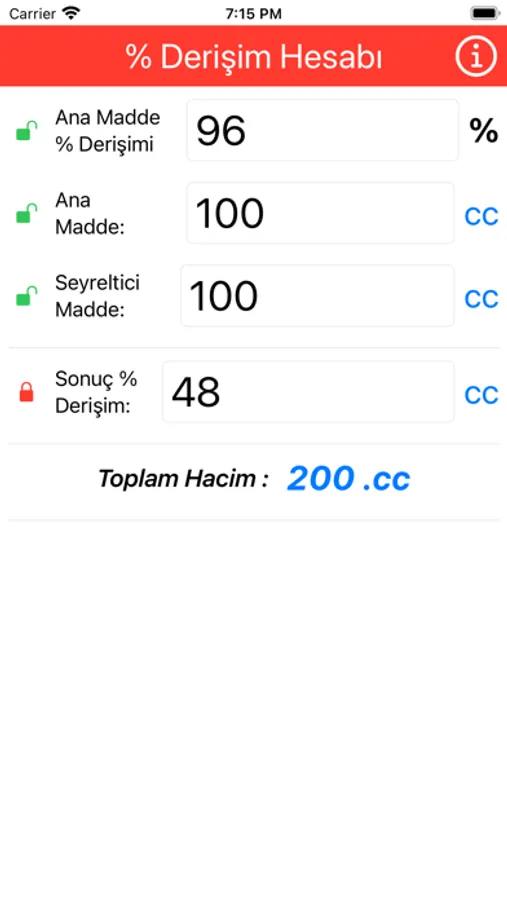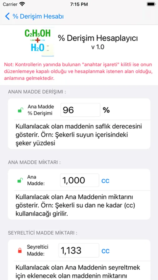 Oluşturmak istediğiniz çözeltide ana maddenin yüzde kaç olduğunu ve toplam hacmini rahatlıkla hesaplayabilmeniz için hazırlanan basit bir uygulamadır.