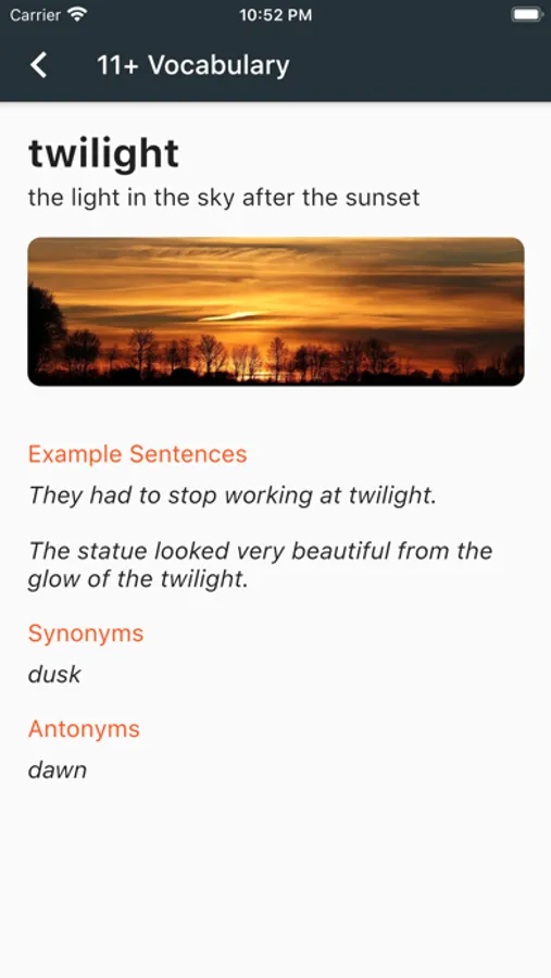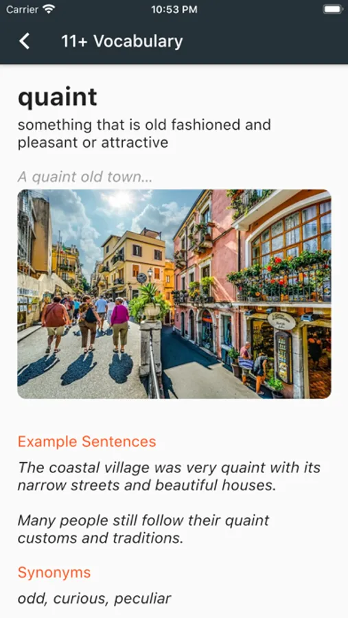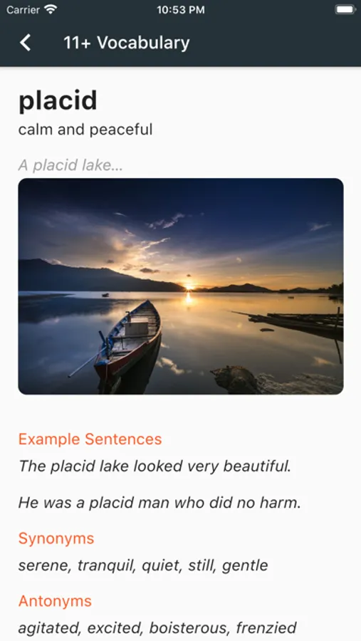 Research has shown that pictures can significantly enhance learning and recall, which was the inspiration behind creating this app of 500 words that appear frequently on the 11+ examinations which could help ace the verbal reasoning and related segments of the exam. Each word is described using intuitive pictures, and is supplemented by definition, example sentences, synonyms and antonyms. The pictures are carefully chosen to intuitively convey the meaning of the words.