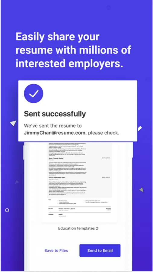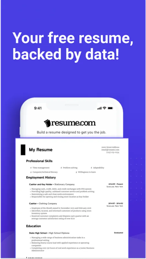 Resume.com is bringing our free resume builder to mobile! With over 2 million free resumes created each year, our resume builder app will help you build a professional resume that helps you get a job.