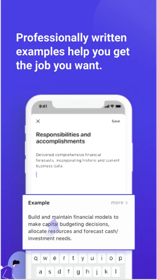 The Resume.com Resume Builder was created with both professionals and recent graduates in mind. We guide you through the process and help you build a resume that meets employers’ expectations. Our in-app suggestions vetted by professional resume writers can help you write job descriptions that highlight your industry expertise.