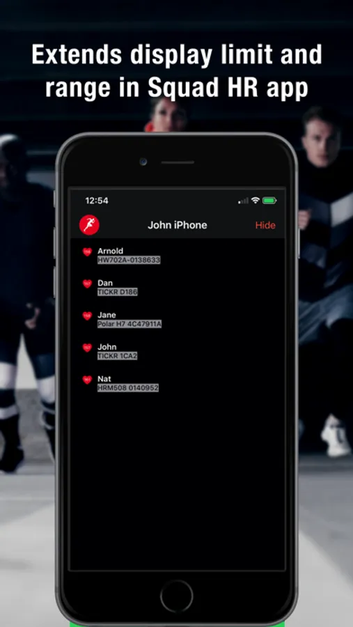 Squad Hub app can increase the display limit on Squad HR app up to 24 athletes simultaneously (requires Bluetooth heart rate monitors^).