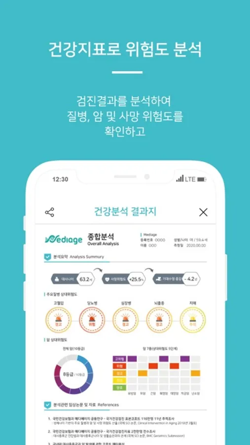 - 분석된 지표로 질병과 사망, 암 상대위험도를 분석한 ‘프롬에이지’ 결과를 확인합니다.
