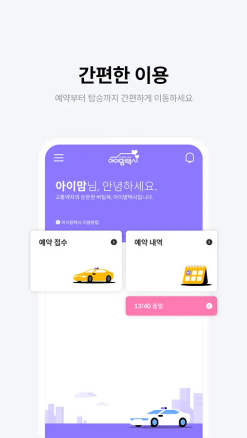 아이맘택시는 이동에 어려움을 겪는 분을 위한 맞춤형 택시 서비스입니다.