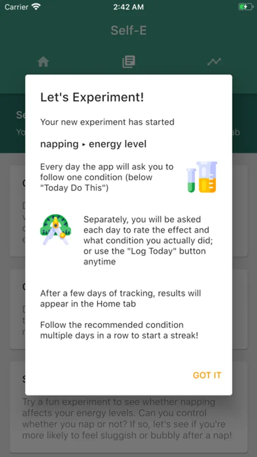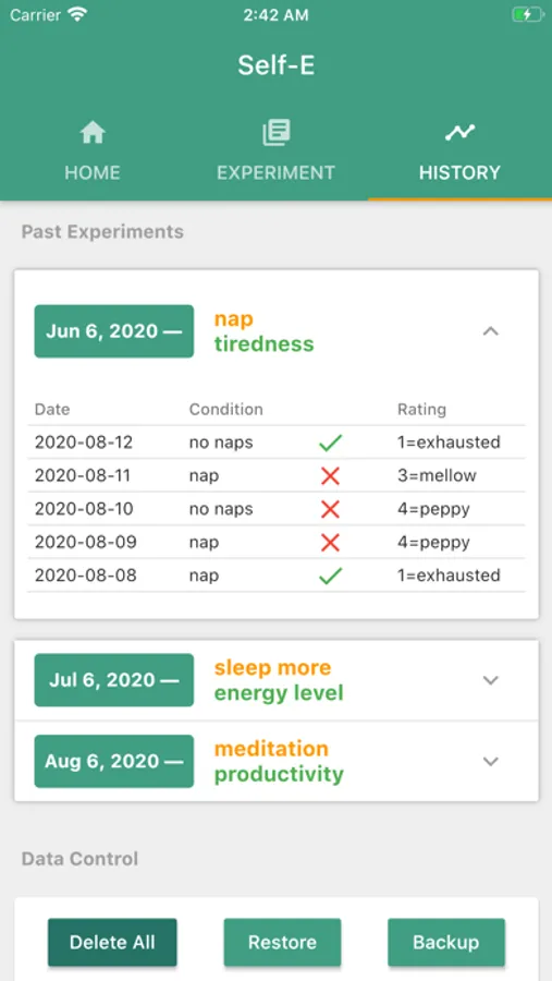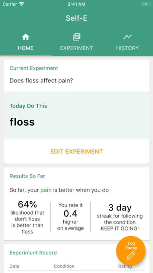 Through Self-E, you can set up experiments, view your data, and attain individualized insights through automated statistical analysis. Self-E sends daily reminders to check in so that your experiment stays consistent and structured.