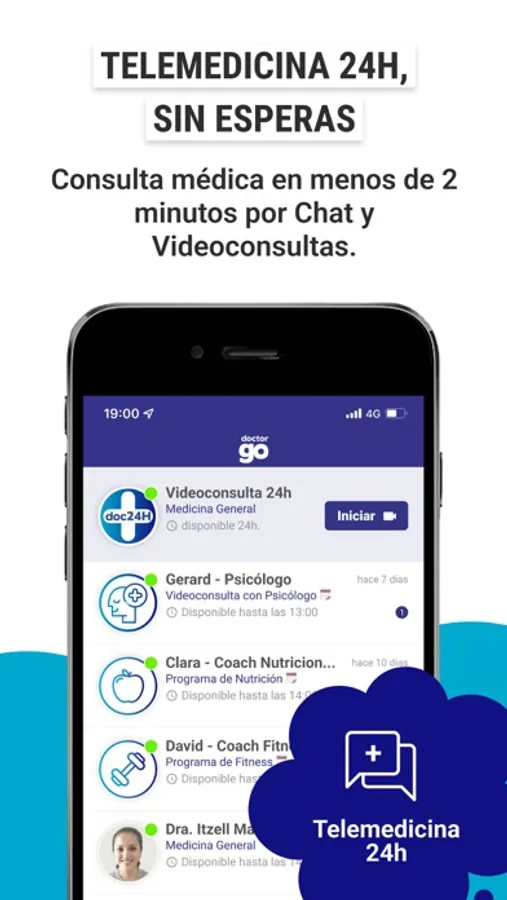 Con DoctorGO, la APP de Salud Online 100% digital, tendrás Telemedicina con chat y Videoconsultas 24h, con la que resolver tus dudas médicas en menos de 2 minutos, a cualquier hora, todos los días del año y sin límite de consultas. Y ahora, sin coste adicional, incluye videoconsultas de hasta 30 minutos con un Psicólogo.