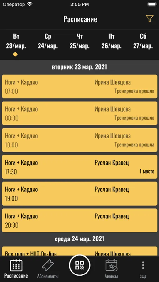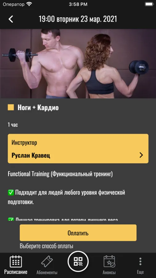 Регистрация в клубе, просмотр расписания и абонементов, запись на тренировки.