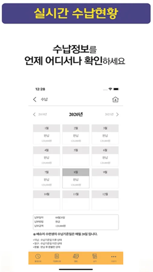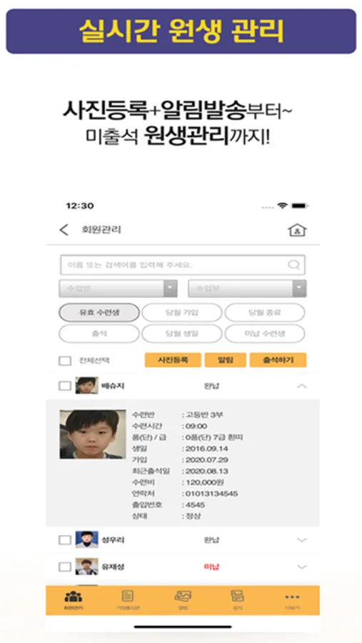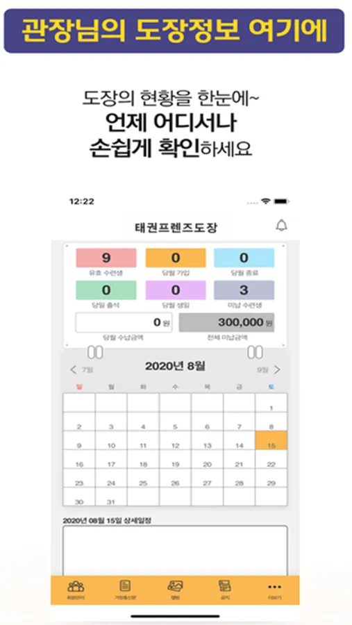 → 메인 화면에서 도장의 수련생 정보, 수납현황을 확인.