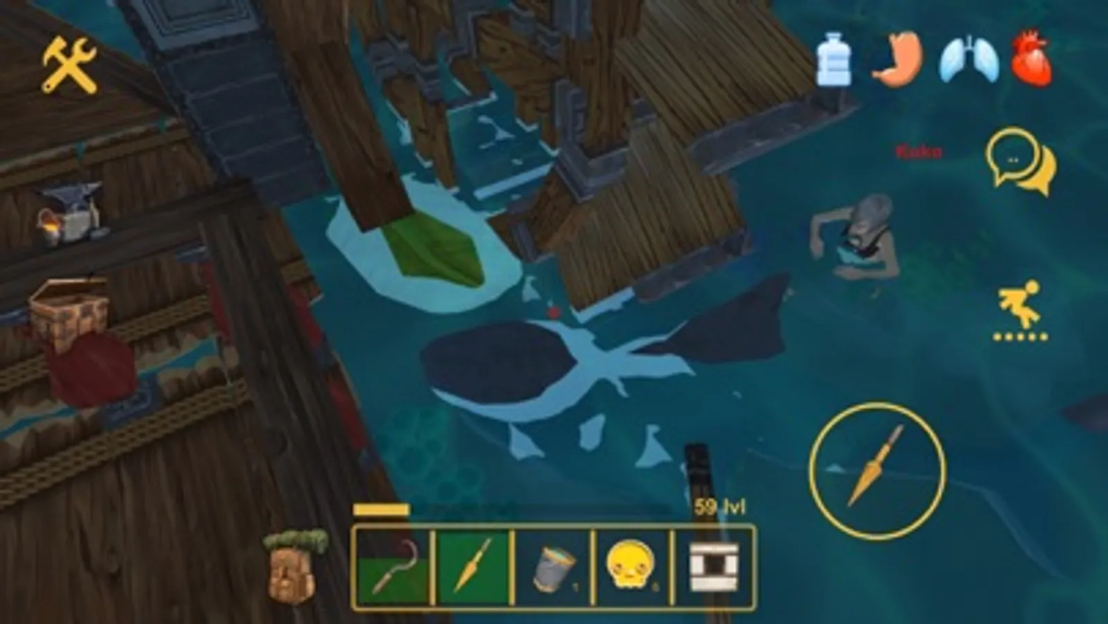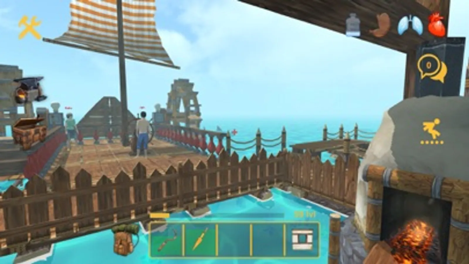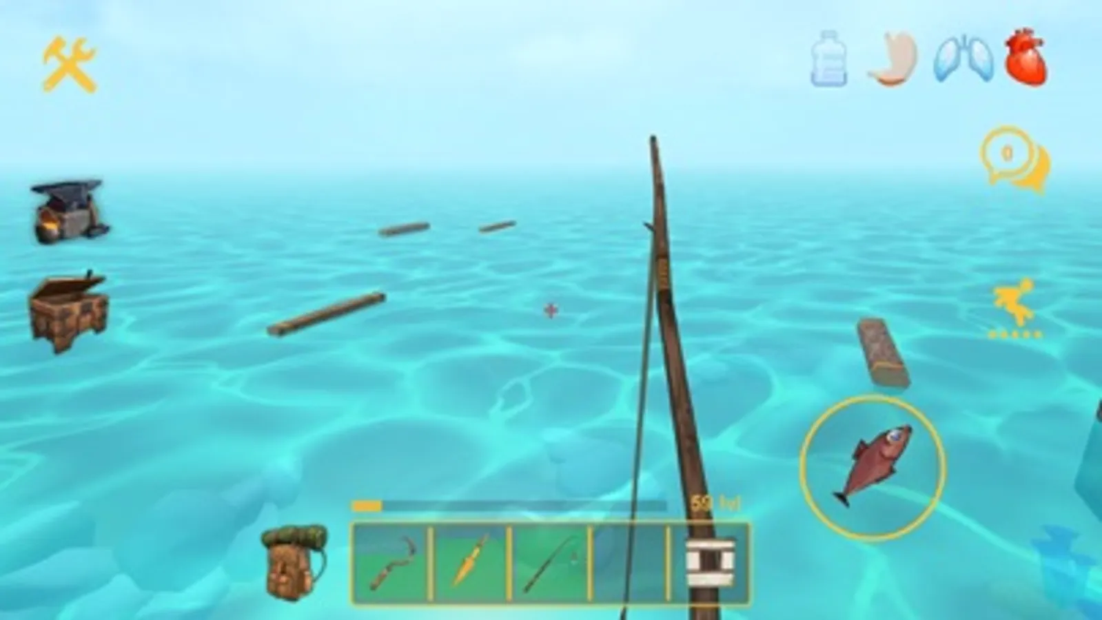 Watch for indicators of health, hunger and thirst. Otherwise your adventure on the raft will quickly end!