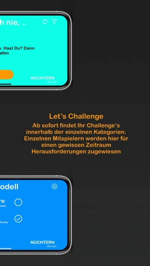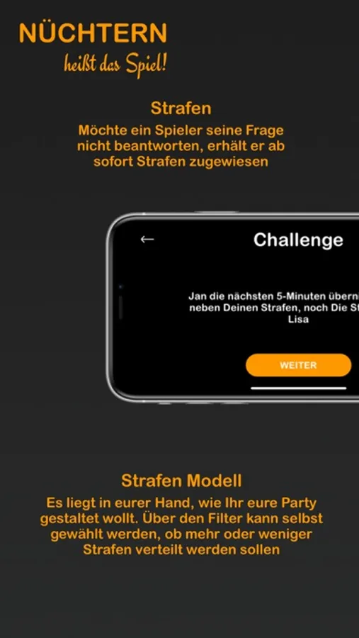 You want to heat up your party? Then NÜCHTERN is exactly the right thing! We guarantee you maximum fun. It will be honest, dirty and the most important, a lot of laughter! Just enter the player names, choose the right category and off you go.