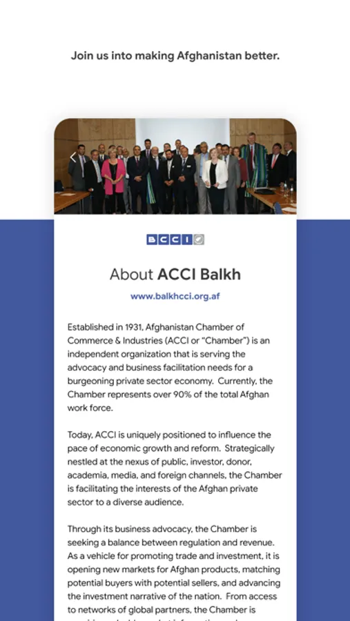 Established in 1931, the Afghanistan Chamber of Commerce & Industries (ACCI or “Chamber”) is an independent organization that is serving the advocacy and business facilitation needs for a burgeoning private sector economy. Currently, the Chamber represents over 90 % of the total Afghan workforce.