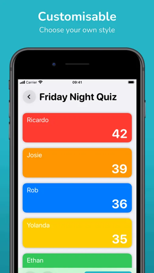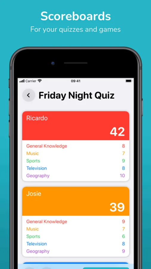 Simple, colourful scoreboards for keeping track of the scores in your games and quizzes. Set player names and colours and record scores by round or simply one point at a time.