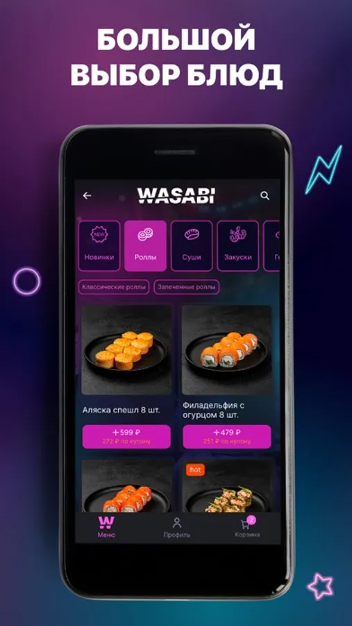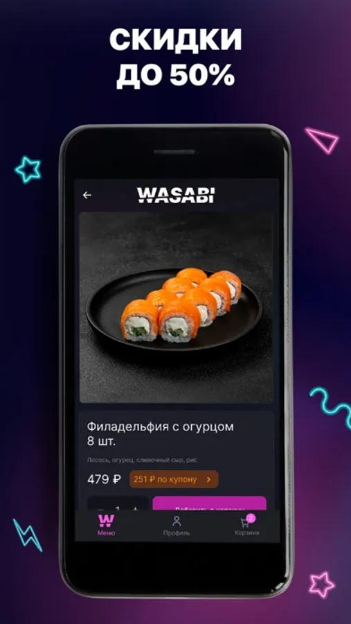 В мобильном приложении WASABI ты можешь заказать еду со скидкой 50%.
