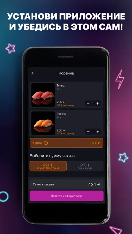 Считай сам: пока у других цены на роллы стартуют от 400 рублей, у нас ты можешь заказать их в два раза дешевле в мобильном приложении! Существенная разница, согласен?