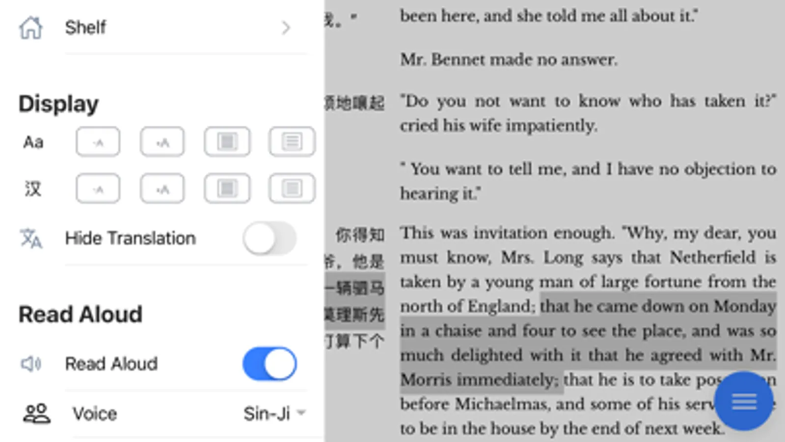The app also provides a read-aloud feature, you can choose different accents and reading speeds, as supported by your device.Books on the shelf includes "Pride and Prejudice", "A Tale of Two Cities", "Twenty Thousand Miles Under the Sea", "Alice in Wonderland", "Around the Earth in Eighty Days", "1984", "Animal Farm", "Gulliver's Travels", "Oliver Twist", "Little Prince" and other works.