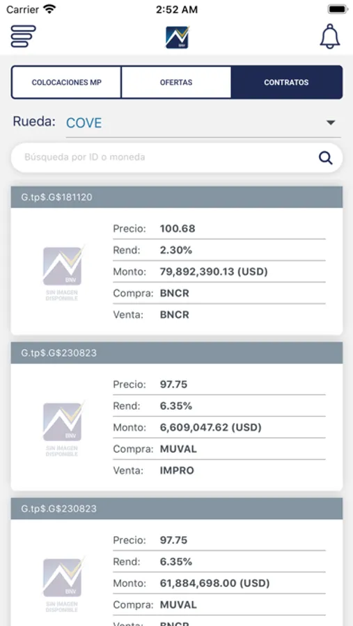 En un solo aplicativo podrá obtener información sobre los instrumentos bursátiles que se negocian en nuestro mercado con sus respectivas variaciones de precio, datos de primera mano sobre las próximas colocaciones de mercado primario, ofertas de las principales ruedas de negociación, así como un detalle de contratos cerrados en el día de consulta.