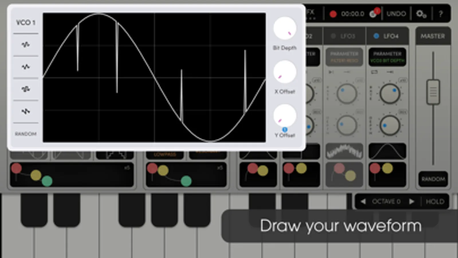 Draw the oscillators waveforms, adjust frequencies using filters, and control any parameters with the LFOs to create unique sounds, possibilities are endless!