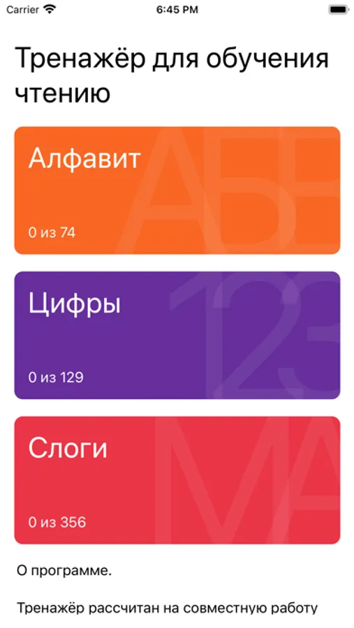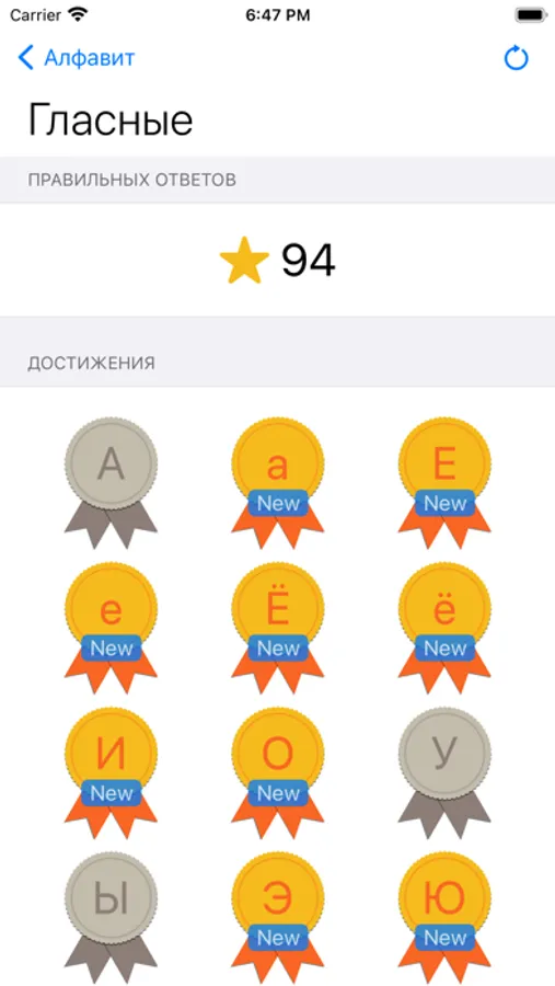 Одна тренировка длится минуту, чем быстрее ребёнок называет буквы, тем больше может успеть заработать звёзд. Показывайте детям награды, это мотивирует их к занятиям. Виртуальная медалька даётся, если буква названа правильно два раза подряд.