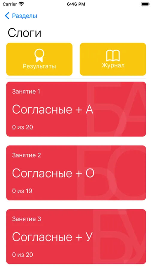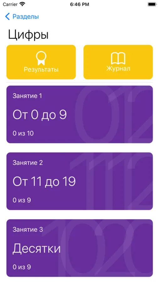 Выберите раздел Алфавит/Цифры/Слоги и занятие.
