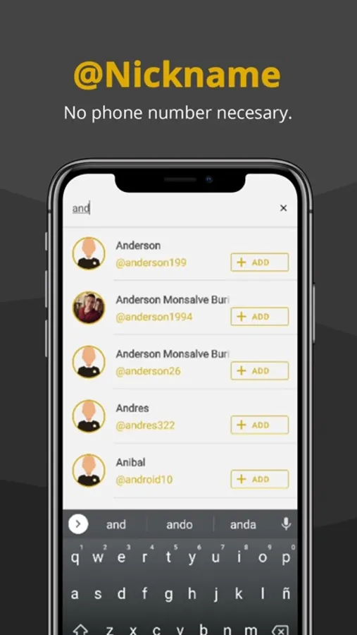 You will have a unique and exclusive nickname which you will choose, it will identify you with all your contacts without needing to know your mobile phone number or your name.