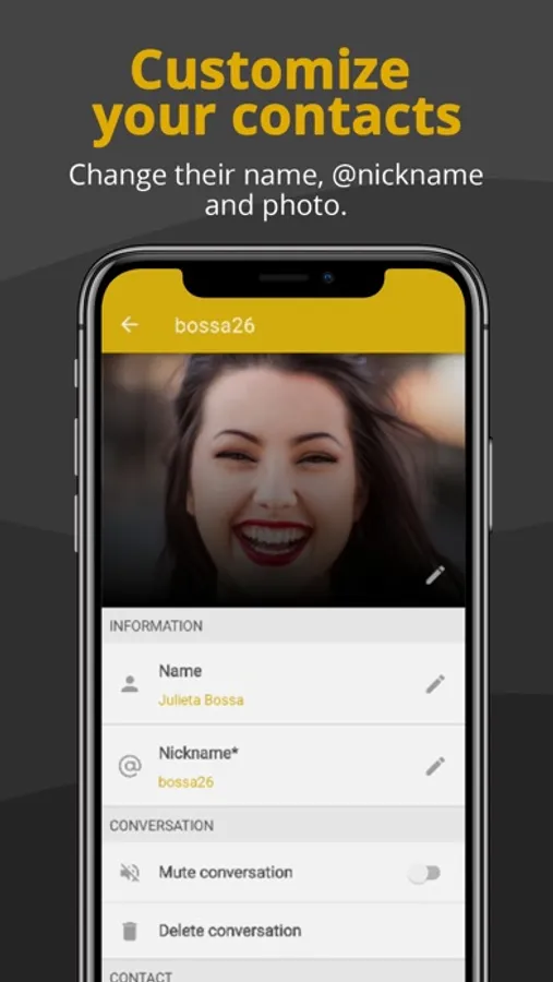You can change the profile photo, nickname and name of your contacts; also, the chat appearance and backgrounds. Share your favorite profile phrase.