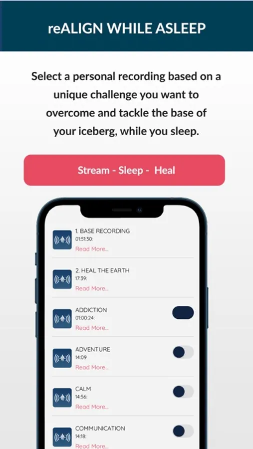 Each night begins with set recordings: 1. Core recording helps you connect the many layers of your entire being and heal the many layers of your past as well as grounds you, 2. To help you manage the energy flow around you 3. To help the earth heal - followed by a recording you choose based on your personal needs. A unique challenge you want to overcome, such as enhancing self-love, finding adventure in exercising, letting go of negative crutches such as addictions and releasing past attachments.
