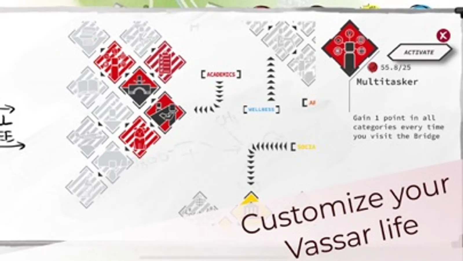 CUSTOMIZE YOUR VASSAR LIFE. Want to be a pure scholar? Here for the party? Or the next Meryl Streep? You can do them all here! There are over 40 skills and thousands of skill combinations for you to live your Vassar life.