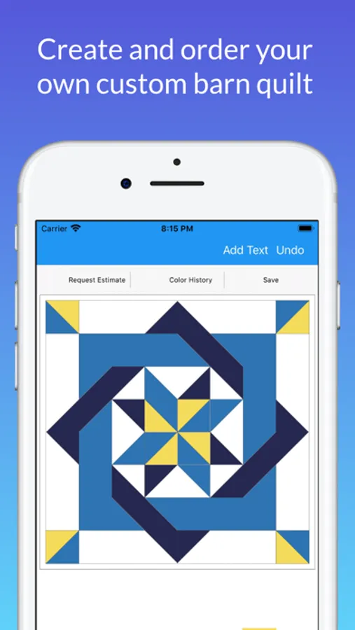 It's easy to create your own custom barn quilt today! First select a pattern from our library. Tap to fill quilt pieces with color. You can create your own custom colors and add text. Get creative! You can save and edit your designs.
