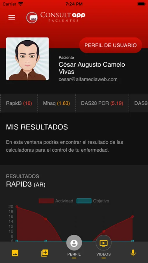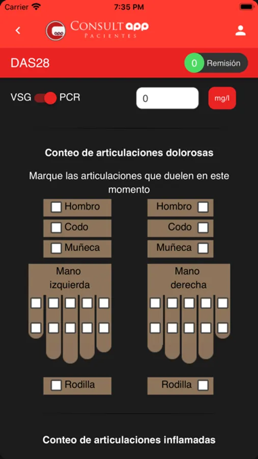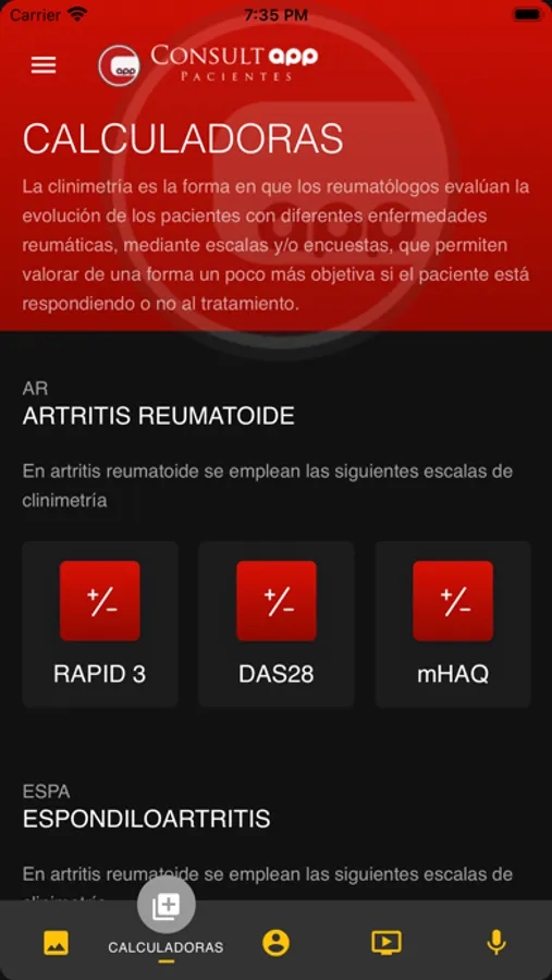 calculadoras que le permitirán hacer un seguimiento del grado de actividad de su enfermedad, asi como el compromiso funcional o en calidad de vida, elementos que le permitirán a su médico tratante, tomar decisiones para mantener o cambiar el tratamiento de su enfermedad. Además encontrarán elementos de desarrollo digital que le ayudarán a llevar un mejor seguimiento y control de sus enfermedades. En este orden de ideas, ConsultApp pacientes brindará información y herramientas digitales que empoderarán al paciente y su cuidador, acerca del conocimiento, gestión y control de sus enfermedades crónicas.